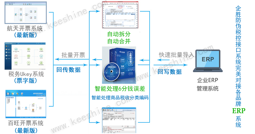 (1)无需额外硬件投入,企业ERP系统将同航天或百旺开票系统实现无缝连接,可保证业务系统与税控开票信息资料的一致性!